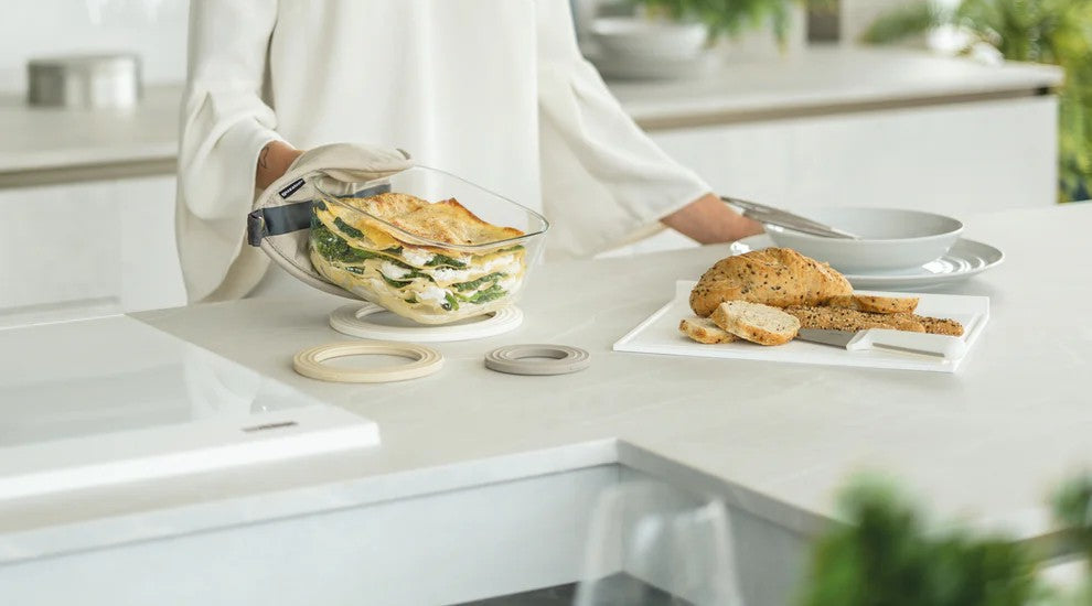 An elegant, functional trivet specially shaped to transform into three separate ones, multiplying the forms that can be supported and expanding the surface for large pots or baking dishes.
