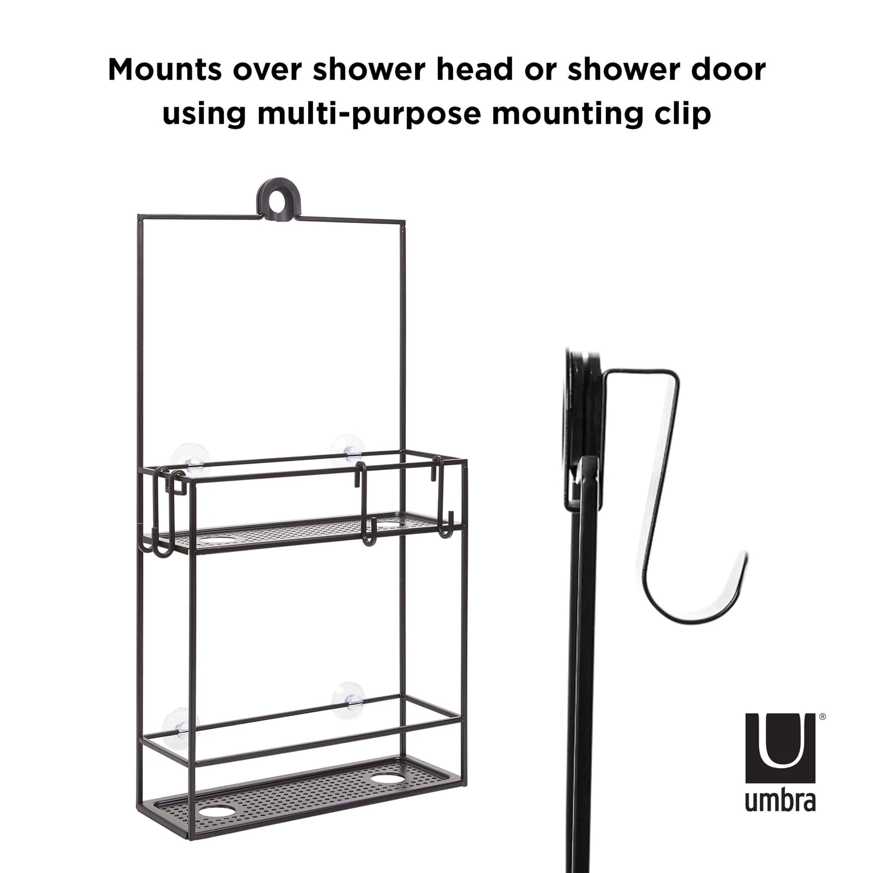 The Cubiko Shower Caddy is composed of two large shelves, a versatile hook for hanging over your shower head or clipping to a shower door, suction cups for additional stability and s-hooks for customizable storage. Cubiko features drainage holes built throughout it, ensuring your products dry quickly. Each shelf has two larger holes that allow shampoo bottles to be stored spout down, so product can be dispensed more easily. Cubiko can be hooked over your shower head or shower door.
